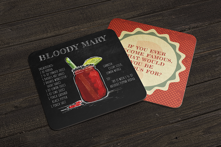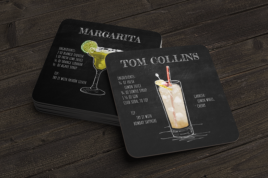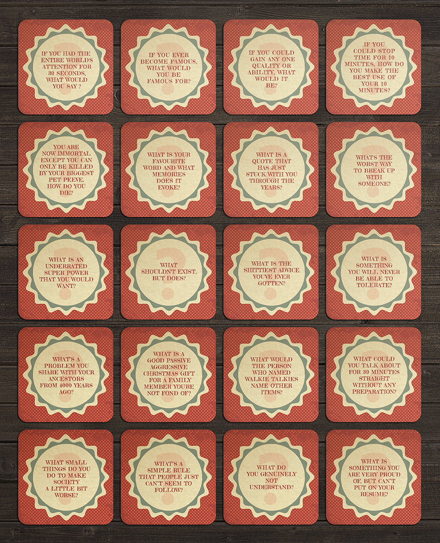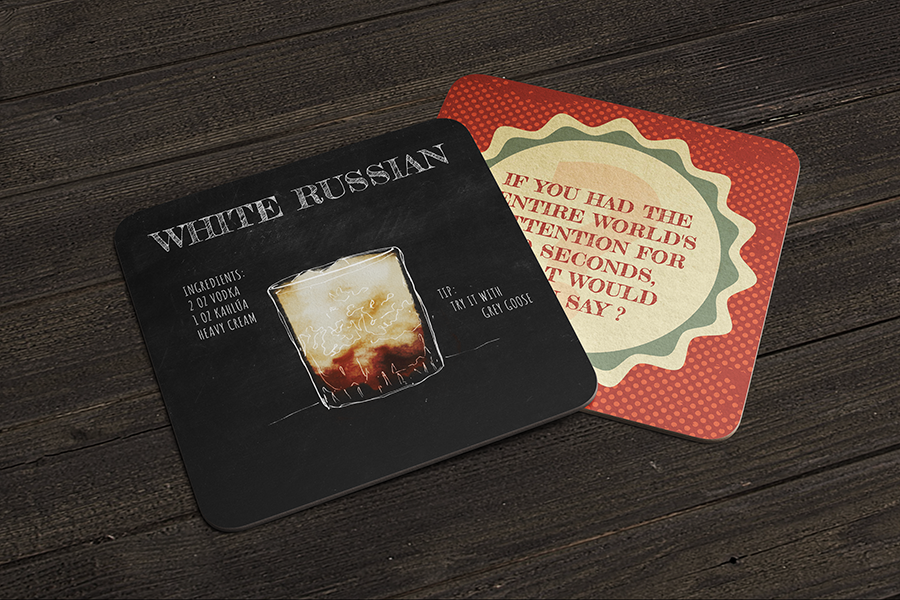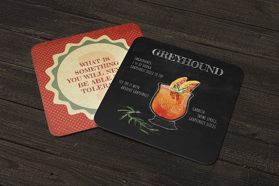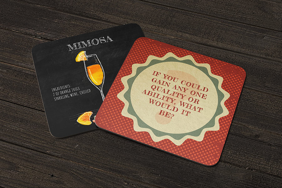 A series of coasters with cocktail recipes on one side and conversation sparking questions on the other.