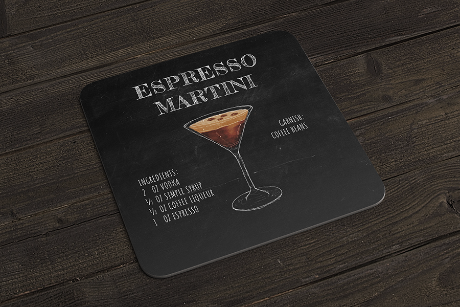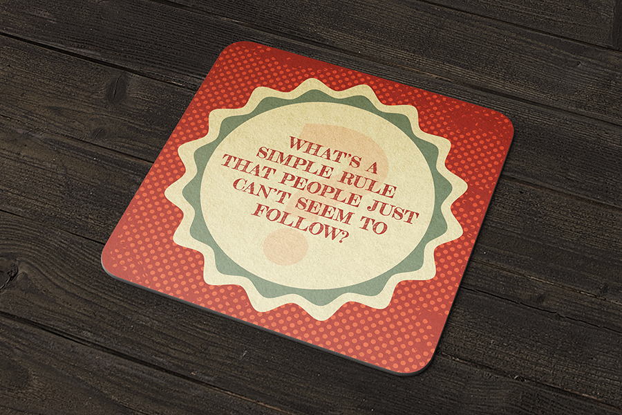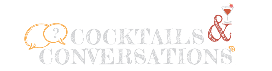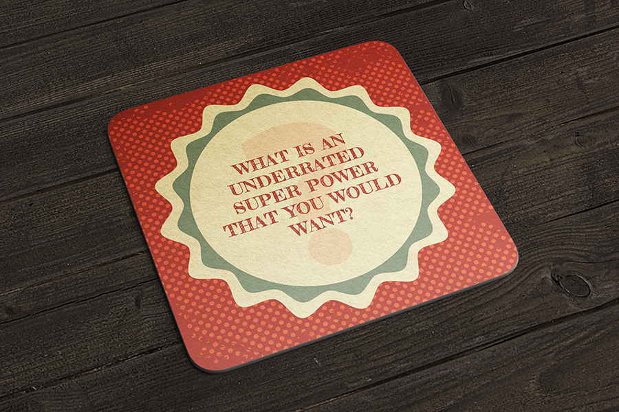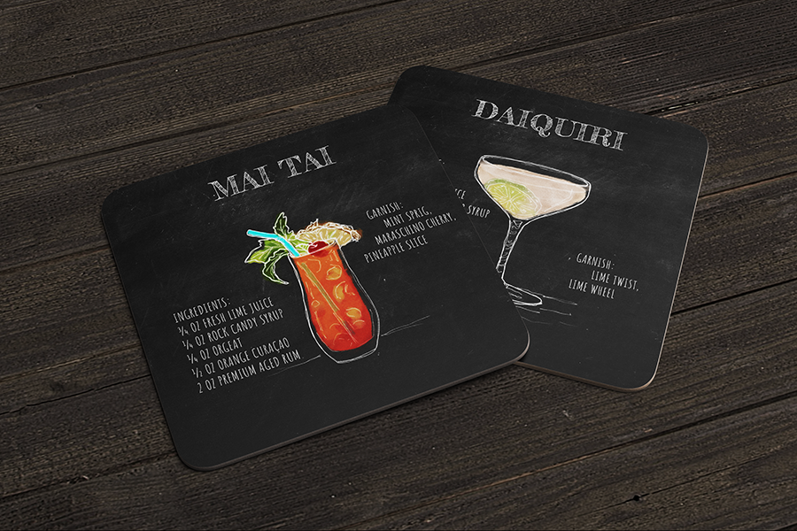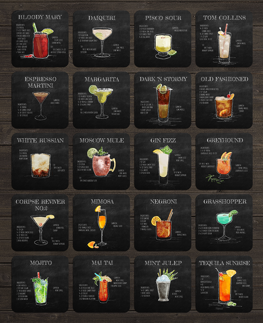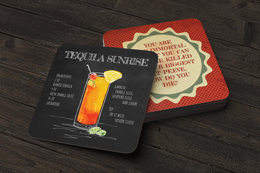 A series of coasters with cocktail recipes on one side and conversation sparking questions on the other.